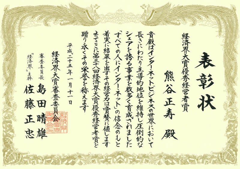 経済誌「経済界」による第38回 「経済界大賞 優秀経営者賞」(2013年)